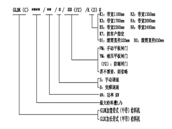 加寬加長帶式(甲帶)給料機(jī)型號(hào)說明: